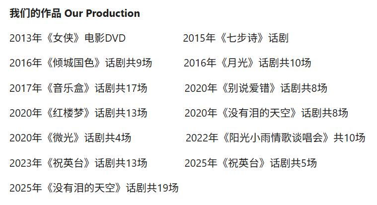 剧团代表作品包括《月光》《音乐盒》《红楼梦》《祝英台》《没有泪的天空》等。制作特色结合高清LED背景、3D技术及高品质音响,带来沉浸式舞台体验。《音乐盒》更成功走向国际,在台湾及印尼演出,推动马来西亚话剧文化交流。